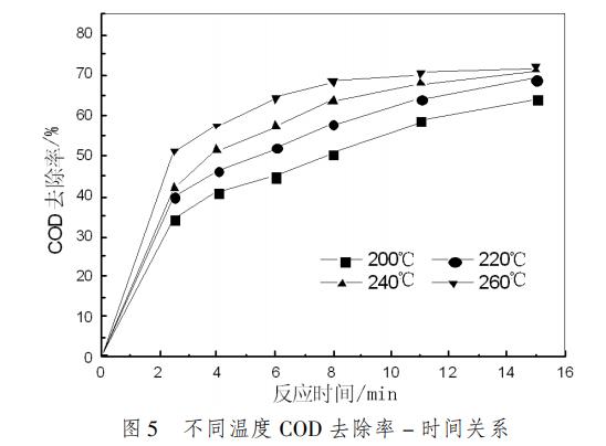 试验考察240℃、5MPa时,有机磷废水在不同浓度(TP从约250~500mg/L、COD值从约1500~2500mg/L)的催化湿式氧化情况,供氧量为COD的3倍,此投加量可保证降解有机磷废水所需的氧化剂量。试验结果如图6、图7所示:随着反应时间的延长,TP及COD去除率逐渐上升且不同初始有机浓度废水的去除率差异减小,15min时TP去除率为92.5%~97.1%,COD去除率为66.5%~73.6%。另外,进水有机浓度越高,最终出水的有机物去除率越高,可见催化湿式氧化法处理有机磷废水在较宽的浓度范围内仍有良好的效果,且更适于处理相对浓度更高的废水。
