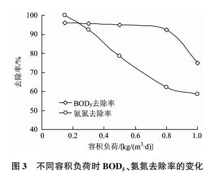 在污水pH为7.0,气水比15∶1时,设置容积负荷分别为0.15、0.30、0.50、0.80和1.00kg∕(m3/d),即对应的进水流量分别为1.875、3.750、6.250、10.000和12.500L∕h,水力停留时间分别为24.0、12.0、7.2、4.5、3.6h,研究容积负荷对污水中BOD5、氨氮去除的影响。